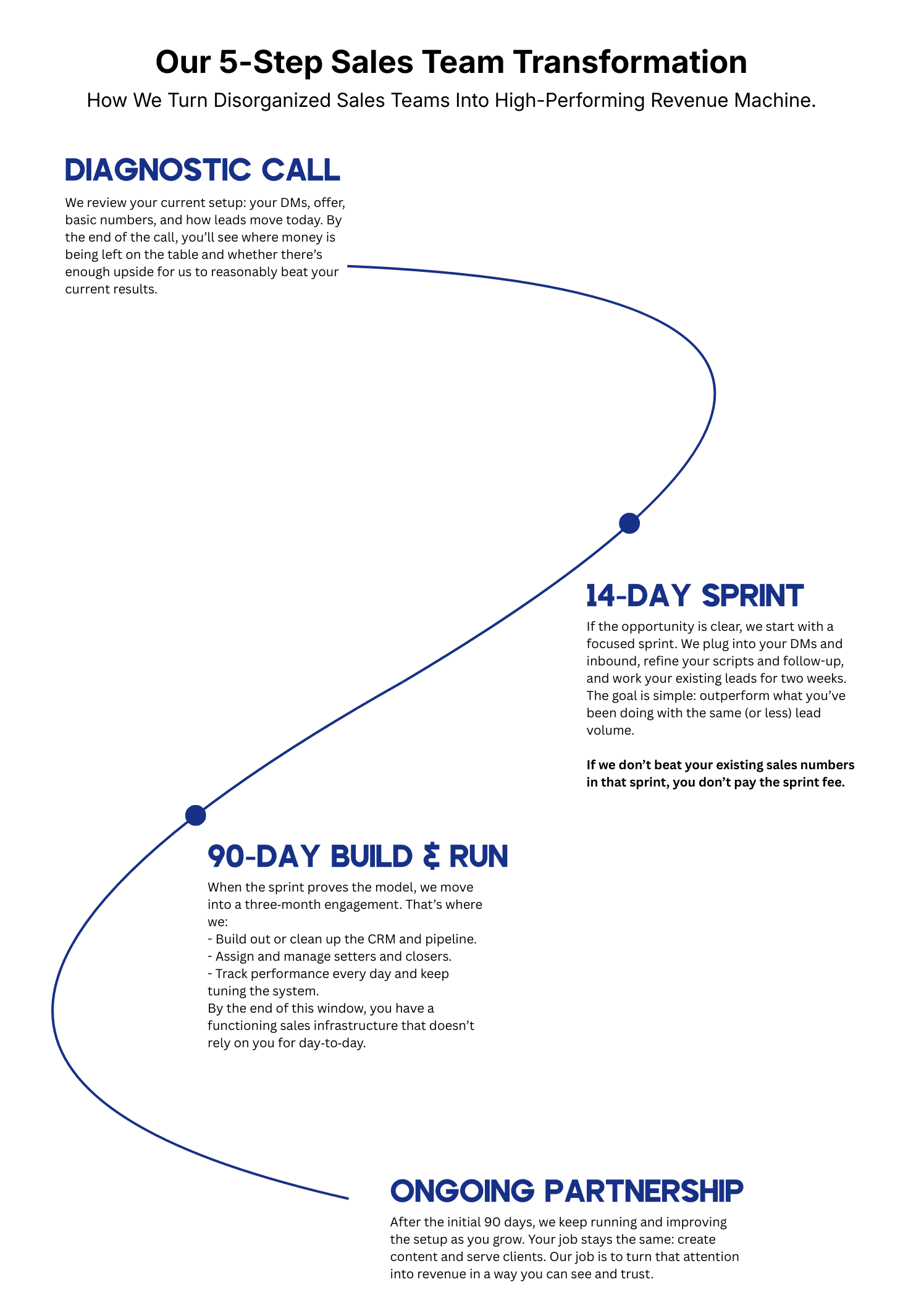 Then you don’t pay for it. Before we start, we’ll agree on a fair baseline based on your recent inbound sales. During the 14 days, we work your prospects through our process. If we don’t outperform that baseline, we waive the sprint fee. That’s our way of taking the risk on ourselves first.