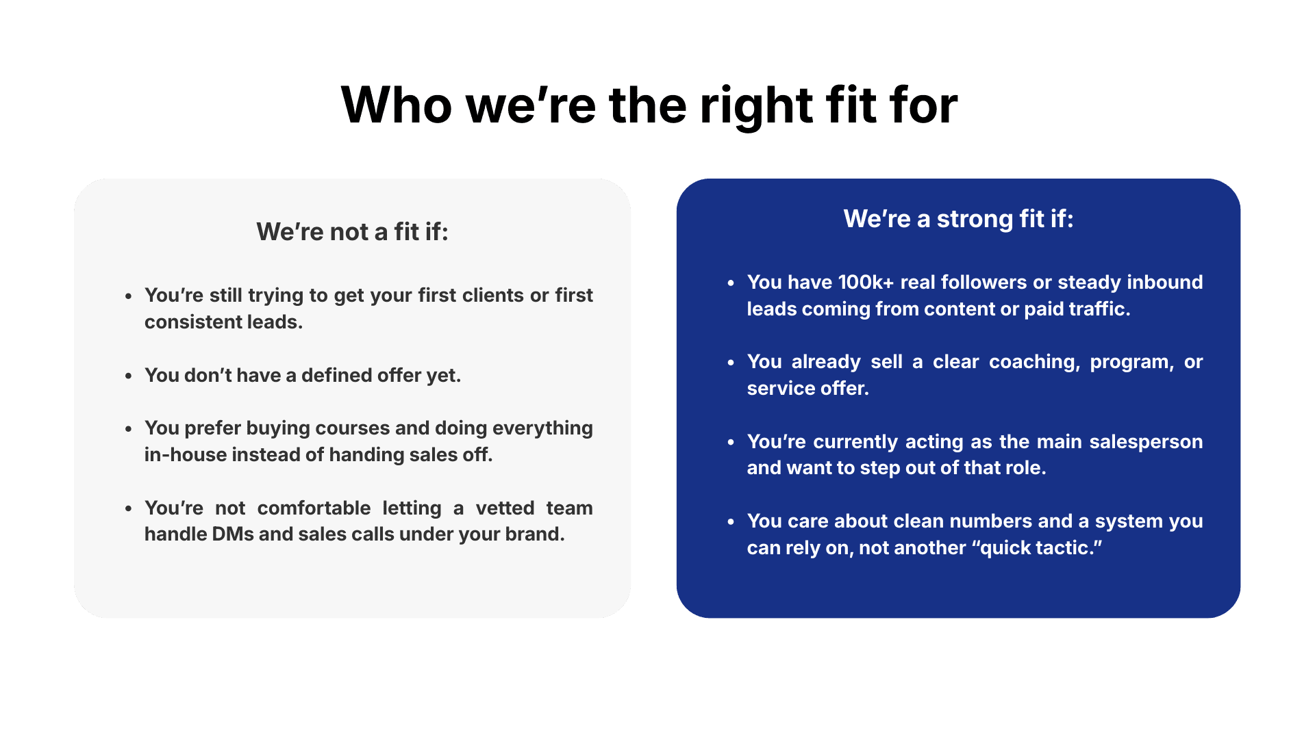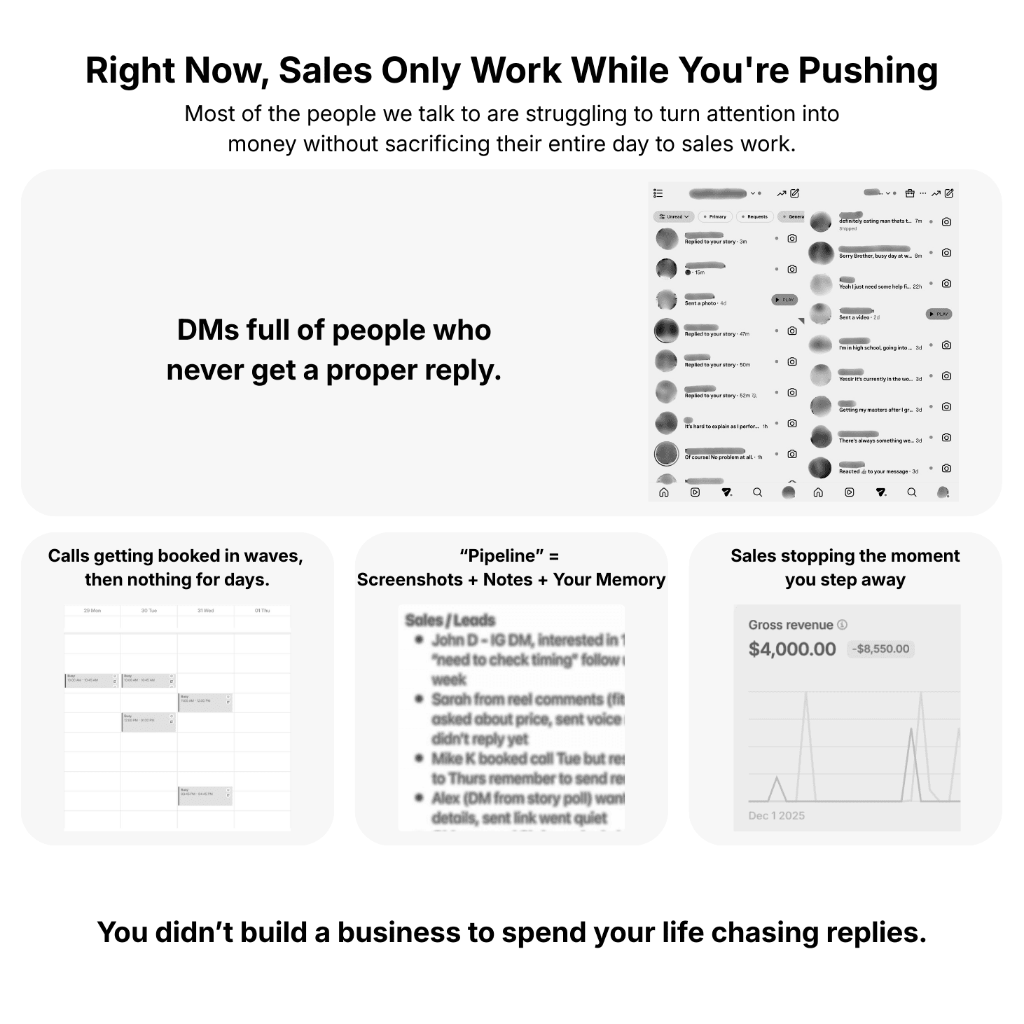 We help online coaches, consultants, and agency owners with steady inbound prospects turn DMs and inquiries into consistent sales without living on calls or in the inbox every day.